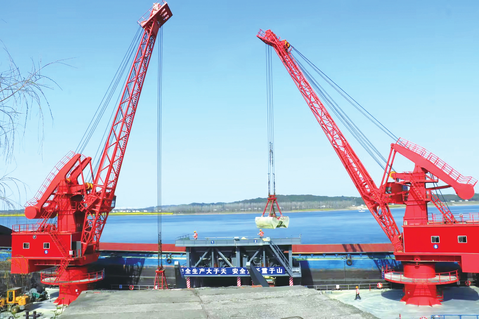3月20日,阳光洒在江面上,宜都枝城沙沱码头一片繁忙。两台20吨级浮吊(浮式起重机)舒展巨臂,巨大的抓斗伸入货船货舱,转瞬间即抓起一斗硫磺,随后,在作业人员遥控“指挥”下,抓斗中的硫磺轻松“流”入料斗,再通过料斗将硫磺转运到货车上。整一个完好的进程安静、高效,既无噪音,也无扬尘。
